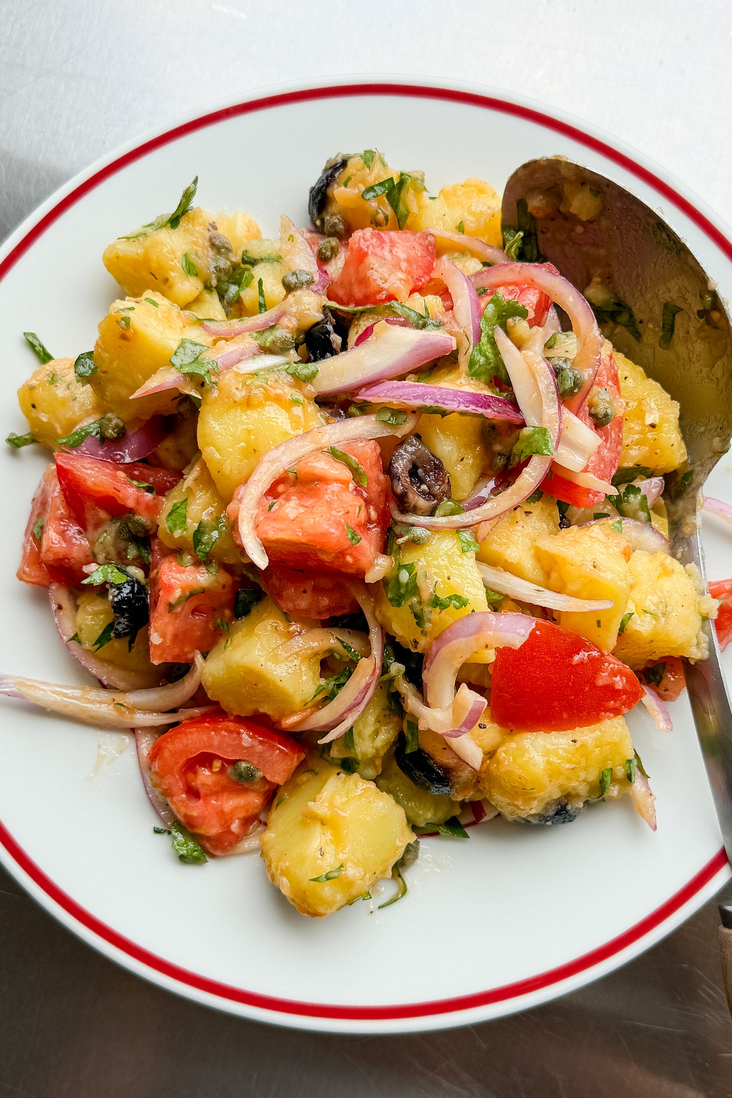 Between the coasts of Sicily and Tunisia lies a small island called Pantelleria where they’re known for a rustic, Mediterranean-style potato salad called Insalata Pantesca. This version draws heavy inspiration from it with a few very minor tweaks. Namely, we used fresh parsley instead of the more common addition of basil, we omitted the dry oregano and used salt-cured black olives instead of wet-brined ones. Nevertheless, it came out fantastic and makes for an incredible accompaniment to octopus, but also grilled chicken, lamb chops or fish.