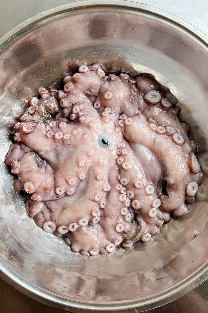 Rinse the octopus well under cold, running water to remove any surface sand or debris from the tentacles and suction cups. Add the octopus to a large mixing bowl along with 3 tablespoons kosher salt. Vigorously scrub and massage the octopus for 2 to 3 minutes to help break down the natural mucus layer on the skin. Fill the bowl with water and continue to scrub the octopus to rinse off the salt. You can optionally let the octopus soak in the water for 30 minutes to 1 hour but it’s not entirely necessary.