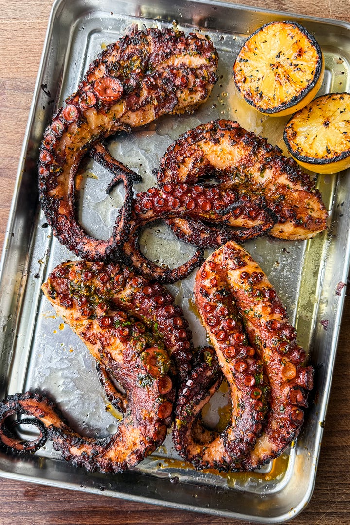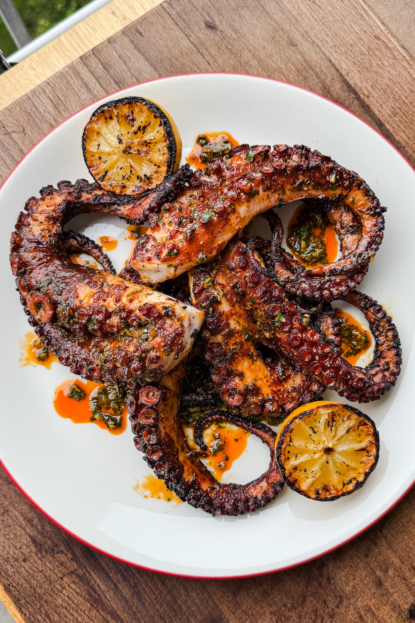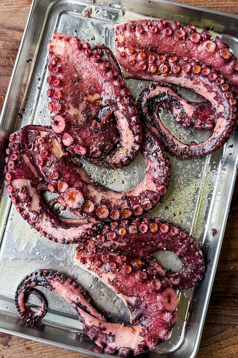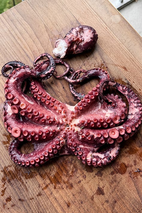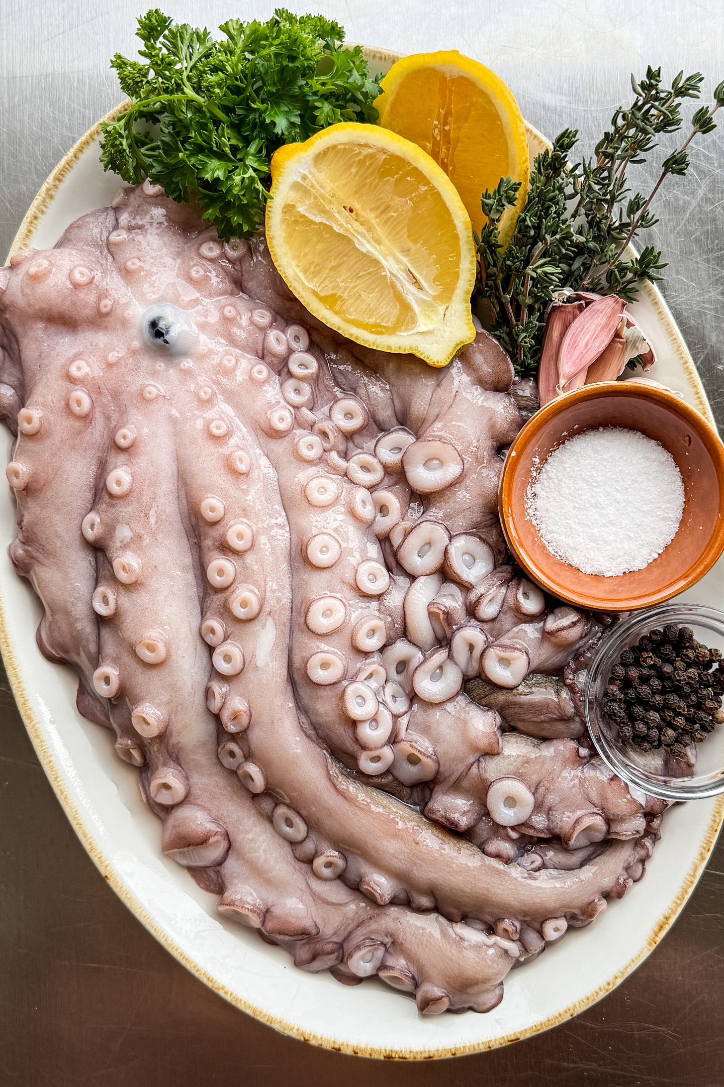 Octopus: A whole, uncooked octopus may look intimidating but please don’t let that deter you from some of the best seafood you will ever enjoy. Slowly simmering it in a pot of water with plenty of aromatics is a necessary step to tenderize the meat before it can be grilled.