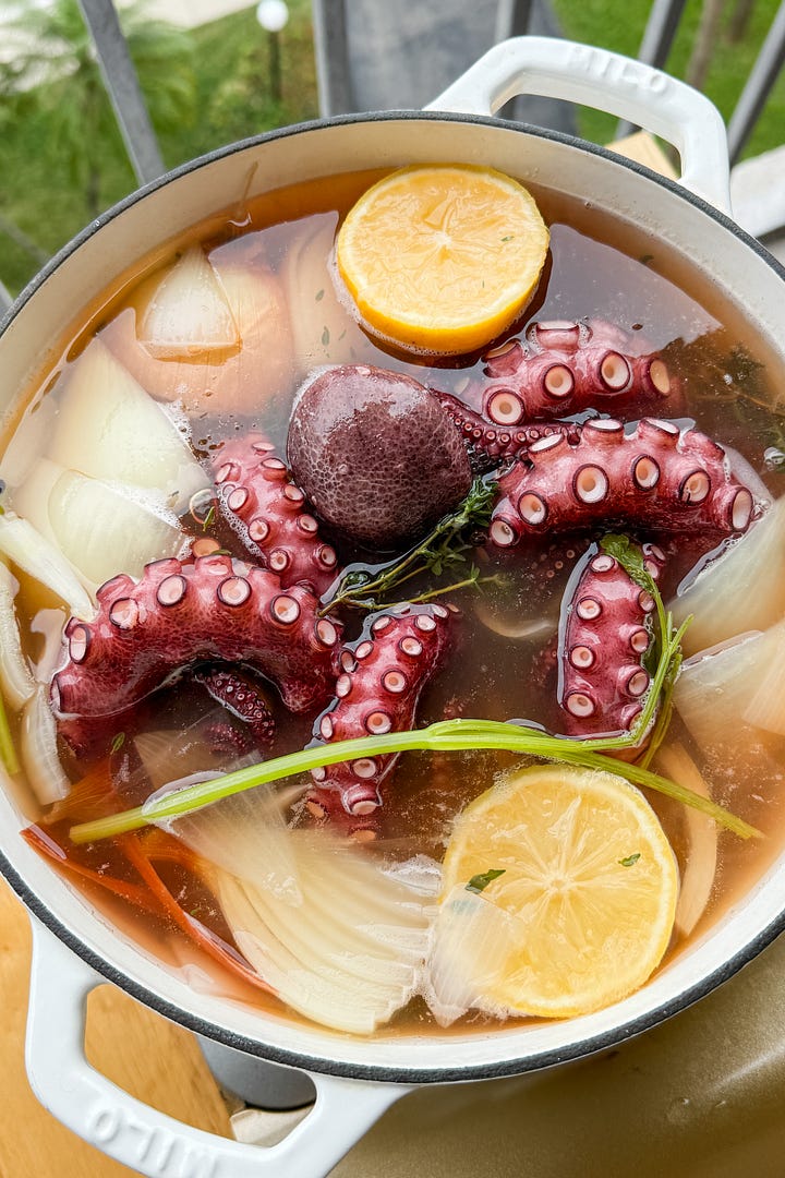 Lemons: The acid in the lemon brightens the poaching liquid and helps tenderize the octopus. You can also grill a lemon along with the octopus for a smoky, citrusy squeeze just before serving.
